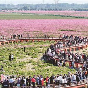 图①:5 月 1 日,在安徽省亳州市谯城区十八里镇蒋李村,游人在芍药花海里赏花游玩。新华社发(刘勤利 摄)