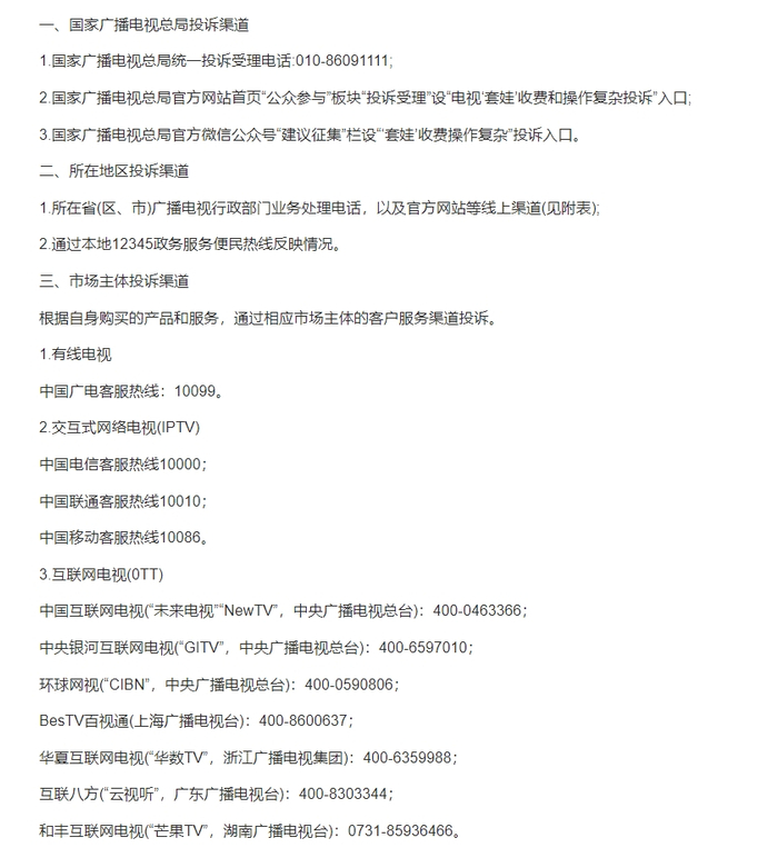 ·治理电视“套娃”收费和操作复杂工作投诉渠道公布。
