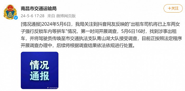 ·网友称出租车司机将两女子反锁车内等拼车,南昌市交通运输局回应。