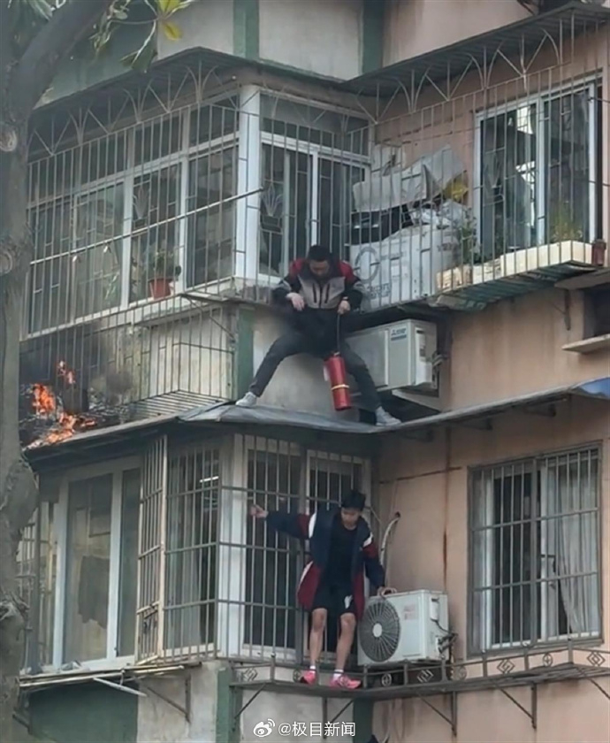 ·浙江宁波一小区阳台起火,快递小哥徒手爬3楼灭火。