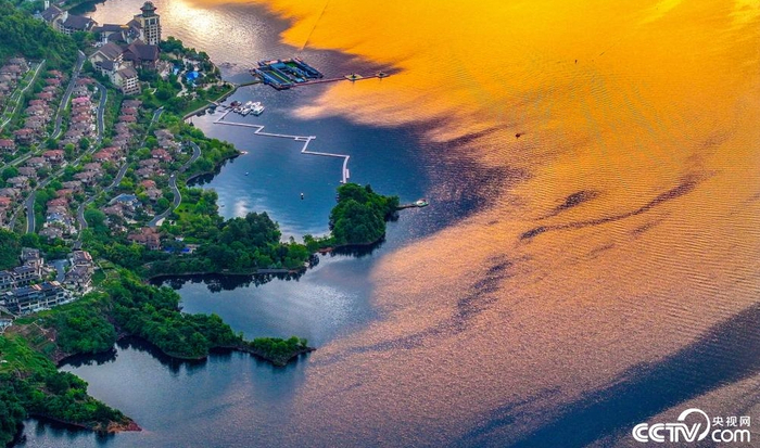 2024年5月6日清晨,杭州千岛湖,朝霞倒影在湖面上,色彩斑斓。