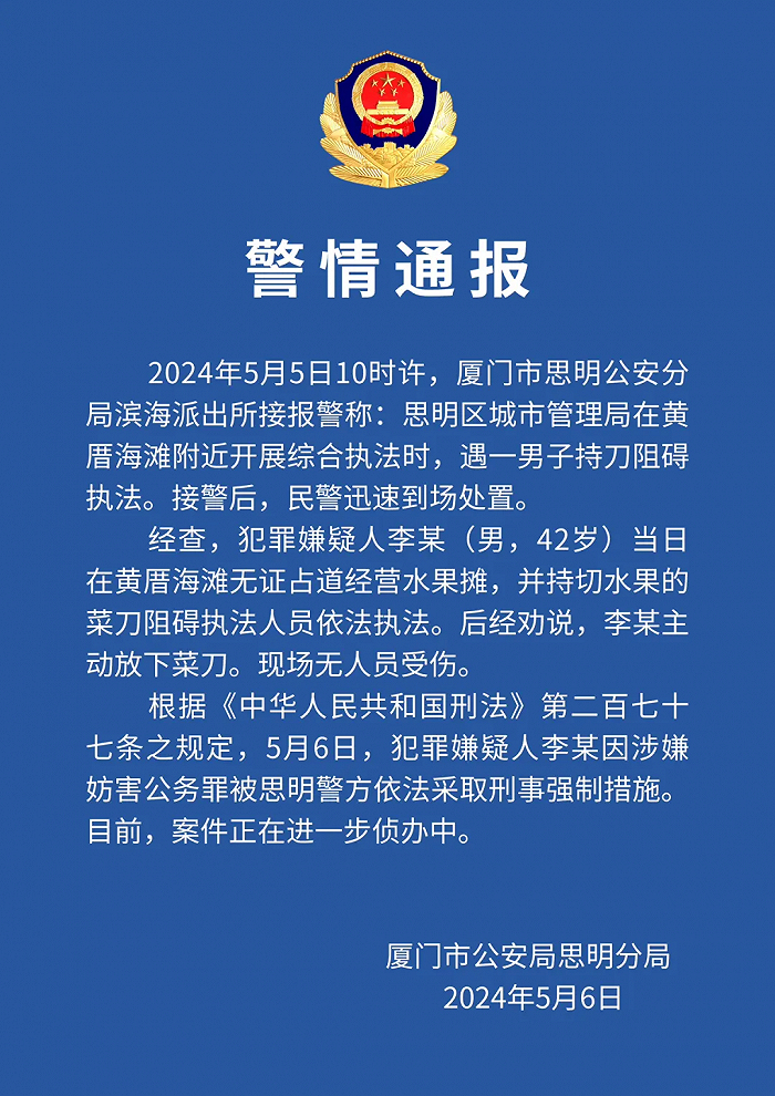 ·厦门警方:无证占道经营还持刀阻碍执法,一男子被采取刑事强制措施。