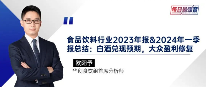 白酒板块:开门红顺利兑现,头部业绩韧性仍强。头部酒企年报、一季报反馈较优,业绩稳中向好,韧性仍强。23Q4淡季以消化库存为主线,24Q1春节旺季驱动增长,收入/利润同增14.9%/15.9%。其中高端与基地型次高端业绩确定性仍佳,扩张型次高端延续承压。具体来看: