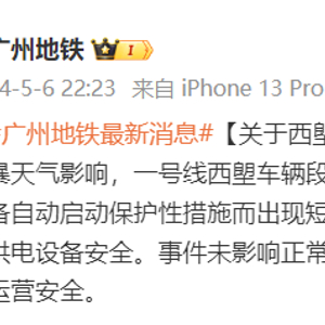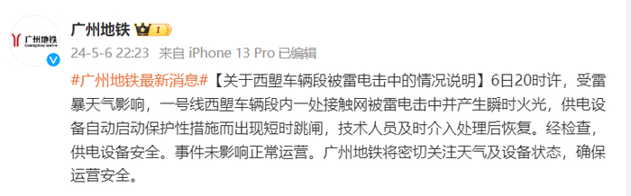 5月6日晚,@广州地铁 发布《关于西塱车辆段被雷电击中的情况说明》。据通报,当天20时许,受雷暴天气影响,一号线西塱车辆段内一处接触网被雷电击中并产生瞬时火光,供电设备自动启动保护性措施而出现短时跳闸,技术人员及时介入处理后恢复。经检查,供电设备安全。事件未影响正常运营。