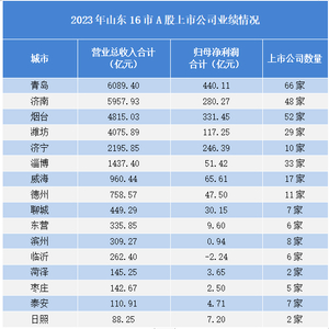 其余城市中,威海17家上市公司2023年营业总收入为960.44亿元,归母净利润为65.61亿元;德州11家上市公司2023年营业总收入为758.57亿元,归母净利润为47.50亿元;聊城7家上市公司2023年营业总收入为449.29亿元,归母净利润为30.15亿元;东营6家上市公司2023年营业总收入为335.85亿元,归母净利润为9.60亿元;滨州8家上市公司2023年营业总收入为309.27亿元,归母净利润为0.94亿元;临沂6家上市公司2023年营业总收入为262.40亿元,归母净利润为-2.24亿元;菏泽2家上市公司2023年营业总收入为145.25亿元,归母净利润为3.65亿元;枣庄5家上市公司2023年营业总收入为142.67亿元,归母净利润为2.50亿元;泰安7家上市公司2023年营业总收入为110.91亿元,归母净利润为4.71亿元;日照2家上市公司2023年营业总收入为88.25亿元,归母净利润为7.20亿元。
