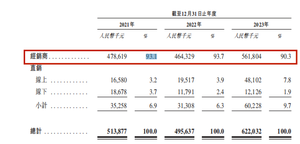 另外值得注意的是,全品文教的收入主要依赖于经销商。2021年、2022年及2023年,经销商为全品文教贡献的收入分别占全品文教总收入的93.1%、93.7%及90.3%