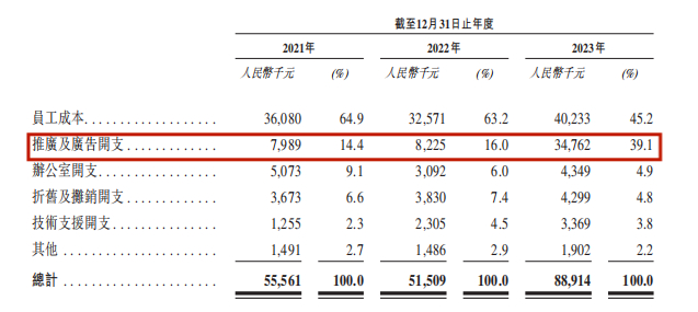 2021年-2023年,全品文教的推广及广告开支分别为798.9万元、822.5万元及3476.2万元