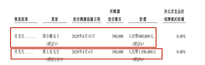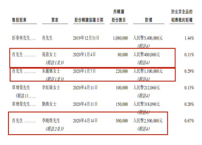 值得注意的是,A轮融资前,肖忠远曾向五位自然人转让了股份,以此套现了610万元。其中,向北京全品当时的员工苑蓓、朱丽娜5元/股的价格分别转让了北京全品8万股、22万股股份;向好友季晓煜、郑土良5元/股的价格分别转让了50万股、30万股;向首席财务官、董事会秘书邵小鹏2元/股的价格转让了30万股。