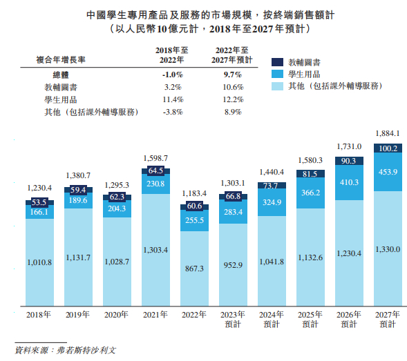 不过,纵使“双减”也阻挡不了鸡娃家长的热血。对家长和学生来说,教辅书是个刚需,不管学不学,相关的配套必须跟上。据弗若斯特沙利文预计,2023年的教辅图书市场规模又同比上涨了10.2%。