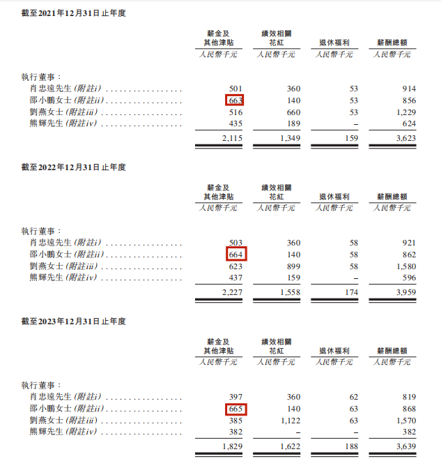 可以发现,肖忠远彼时向邵小鹏转让股份的价格低于其他四人。除此之外,邵小鹏于2021年-2023年领取的薪金及其他津贴也比其他三位董事及最高行政人员要多,甚至多过了董事长肖忠远