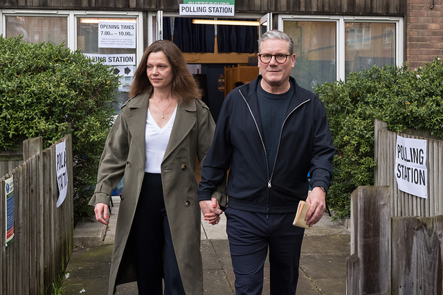 当地时间2024年5月2日,英国伦敦,英国工党党首基尔·斯塔默与妻子维多利亚在地方选举中投完票后离开投票站。