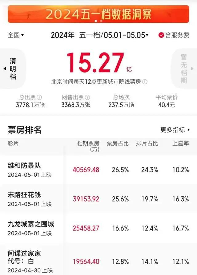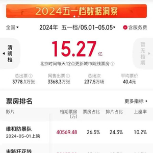 15.27亿票房,3777.5万观影人次,5部影片破亿,今年五一档发挥稳定,没有太多惊喜,但也不如之前大家所预期的那般“惨烈”,票房和观影人次都维持了和去年差不多的水准,《维和防暴队》《末路狂花钱》《九龙城寨之围城》等影片的总票房预测落点都超过了映前预测,在旅游热、演出热的夹击下,电影仍然是一种娱乐“刚需”。