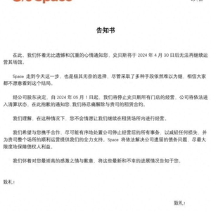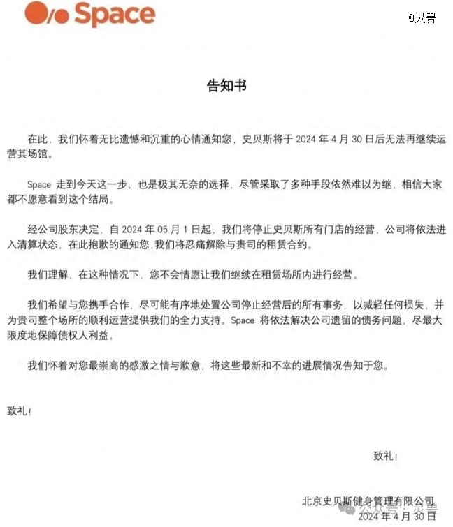 紧接着,4月30日晚,定位高端健身房的SpaceE也向会员及物业方发布《告知书》,宣布旗下所有门店将在5月1日起停止运营,公司将依法进入清算状态。5月1日,包括北京国贸SPACE等门店的物业方发布通知,宣布门店闭店。按照公告,Space选择闭店清算,是公司股东做出的一致决定。