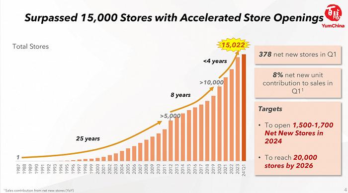 根据最新发布的财报,2024年第一季度,这家旗下经营着肯德基必胜客塔可钟、 Lavazza、小肥羊、黄记煌等品牌的餐饮巨头净新增378家门店,创一季度开店新高,总门店数突破了15000家。