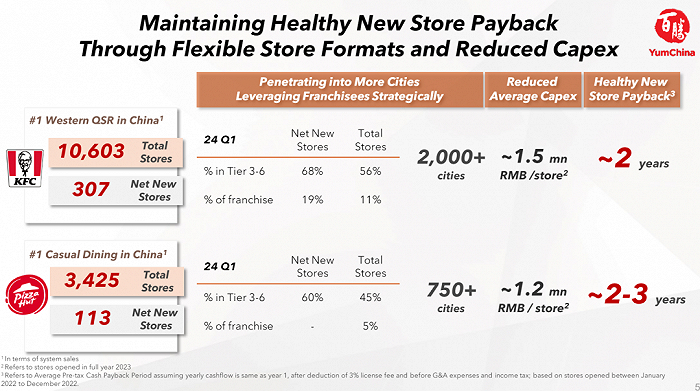 “我们灵活的门店模式使我们能够在不同层级的城市中扩张,并进一步提升渗透率。第一季度,我们2/3的新店是较小的店型。平均而言,我们的一家新店现在只需人民币120万元至150万元的资本支出。我们一直在推动更低的资本支出并创新门店模式。”屈翠容说道。