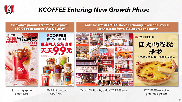 “K Coffee继续保持良好增长,仅第一季度我们就售出了约5000万杯咖啡,杯数销量同比增长了30%。我们很高兴能够进一步渗透这一不断增长的咖啡市场,并开发了‘肩并肩’(side-by-side)的门店模式。”屈翠容表示。