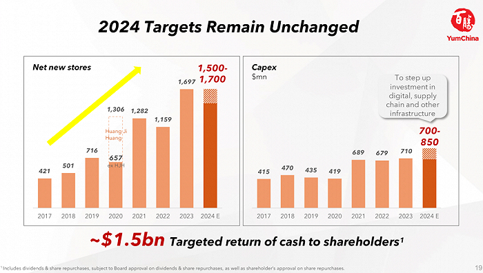 展望2024年,百胜中国表示,门店数量将保持强劲的增长势头,预计2024年净新增1500至1700家门店,并有信心在2026年之前达到20000家门店的目标。该公司致力于在2024年以季度现金股息和股票回购的形式向股东回馈至少15亿美元,资本支出在7亿至8.5亿美元之间。
