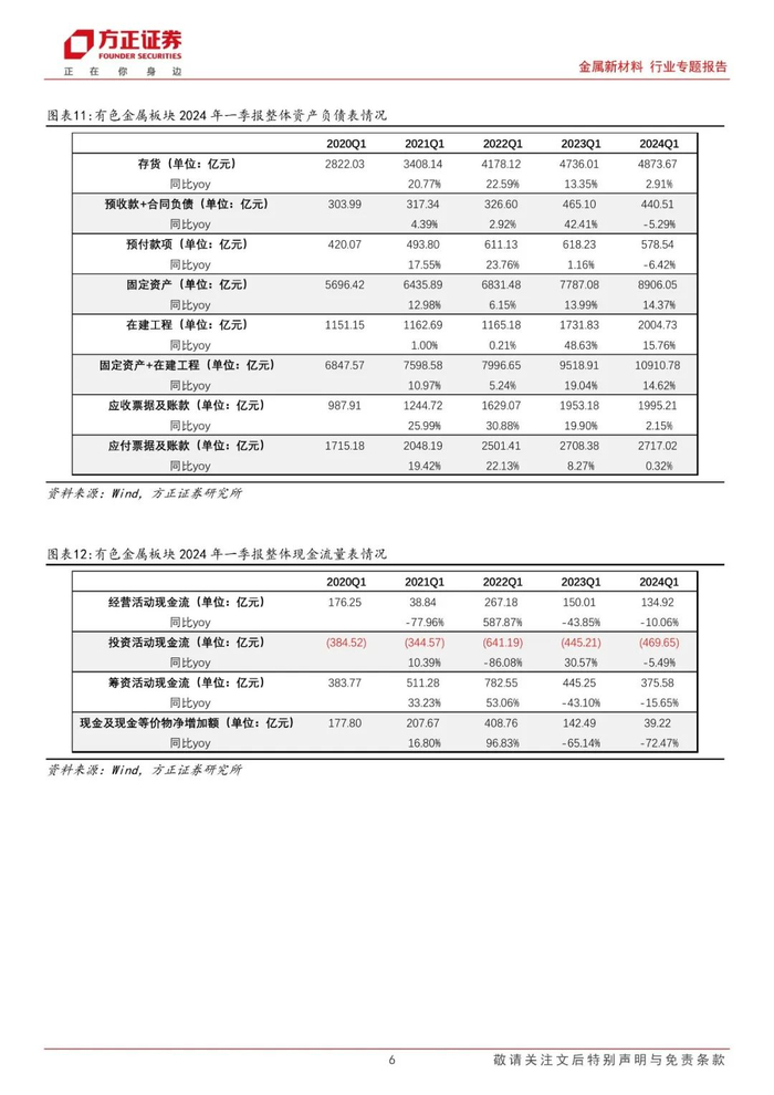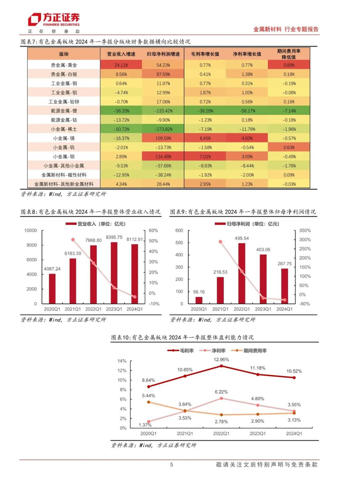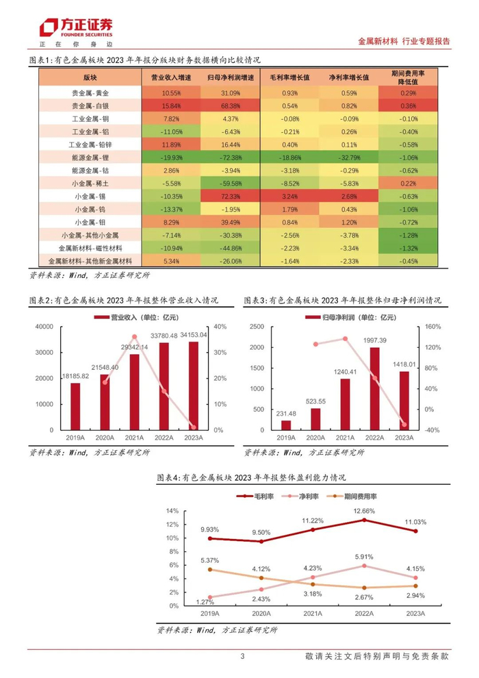 综合2023年报及2024年一季报数据我们认为,在美联储降息预期、经济复苏下内外需求提升、供给扰动下供需缺口拉大等多因素驱动下,贵金属、工业金属等多类商品价格实现稳步提升,对应赛道经营业绩得到有效释放,结构性分化特点明显。整体法看,我们以有色金属核心标的池165支标的为基准,2023年板块整体实现营收34153.04亿元,同比+1.10%;实现归母净利润1418.01亿元,同比-29.01%;2024年一季度板块整体实现营收8112.91亿元,同比-3.37%;实现归母净利润287.75亿元,同比-28.61%。