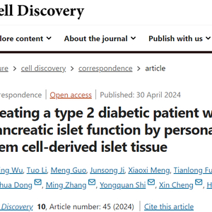 5月7日,澎湃新闻记者从海军军医大学第二附属医院(上海长征医院)获悉,4月30日,该院殷浩教授团队联合中国科学院分子细胞科学卓越创新中心程新教授团队,在国际学术期刊《细胞发现》(Cell Discovery)在线发表了题为“Treating a type 2 diabetic patient with impaired pancreatic islet function by personalized endoderm stem cell-derived islet tissue”的研究成果。这是国际上首次利用干细胞来源的自体再生胰岛移植,成功治愈胰岛功能严重受损糖尿病的病例报道。