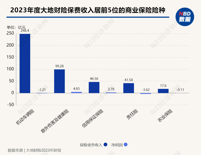 2023年年报显示,公司保费收入居前五位的险种分别为机动车辆险(含交强险)、意外伤害及健康险、信用保证保险、责任险及农业保险,保费收入分别为248.4亿元、99.28亿元、46.56亿元、41.58亿元、17.6亿元,承保盈利分别为-1.21亿元,4.83亿元,2.78亿元、-3.62亿元、-0.11亿元。其中,货物运输险、农险、意外伤害及健康险等非车险种保费增长较快,均实现两位数增长。