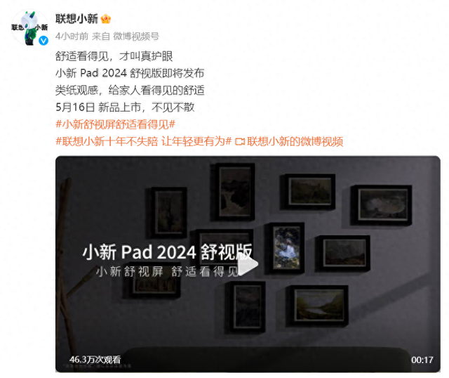 【环球科技频道综合报道】5 月 7 日消息,联想官宣小新 Pad 2024 舒视版平板 5 月 16 日上市,拥有“类纸观感”。