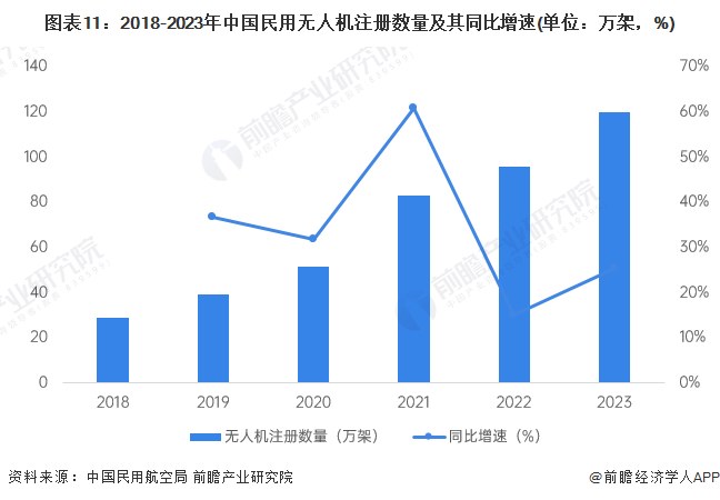 随着我国人均消费水平以及无人机技术水平的提高,公众对智能生活的需求增大,带动民用无人机行业发展,注册数量快速增长。根据中国民用航空局公布的数据,2023年,全国民用无人机注册数量达120万架,同比增长25%。