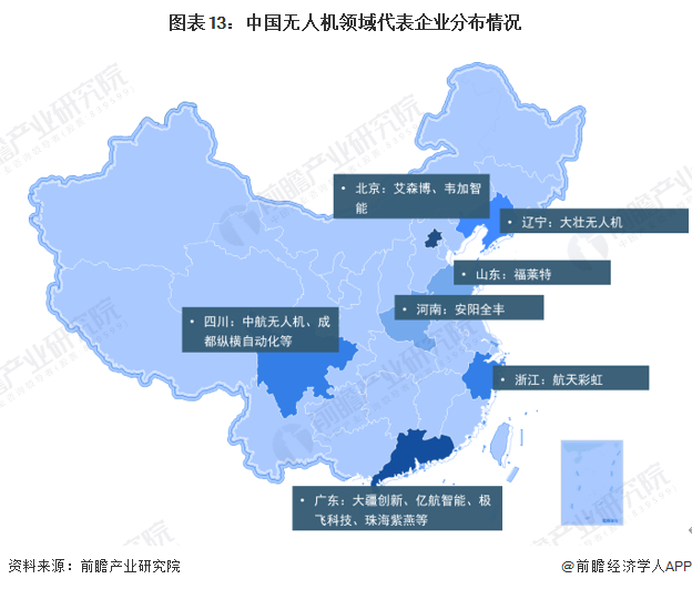 从无人机细分市场来看,大疆创新、中航无人机、航天彩虹等是中国无人机行业领先企业。其中,中航无人机、航天彩虹以军用无人机布局为主,大疆创新在民用无人机市场发展较快。从区域分布来看,领先企业在广东、北京、四川等地较为集中,具体如下: