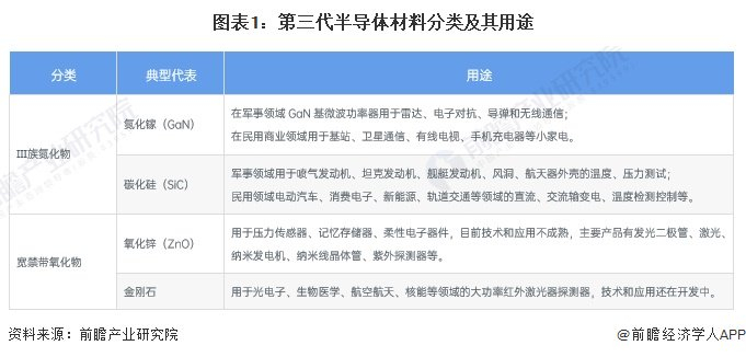 第三代半导体材料主要包括碳化硅(SiC)、氮化镓(GaN)、氮化铝(AlN)、氧化锌(ZnO)、金刚石,目前已实现商业化应用的主要为碳化硅(SiC)和氮化镓(GaN)两类,具体用途如下: