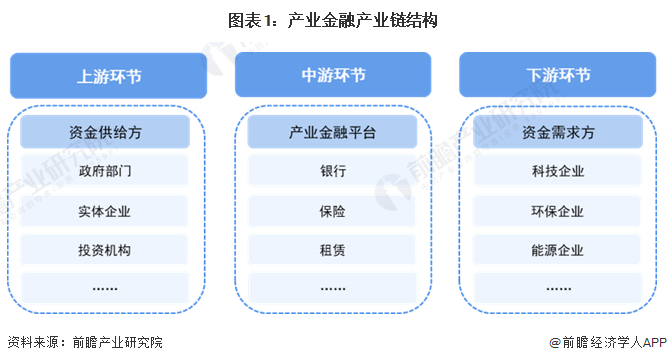 具体来看,上游的资金供应方包括政府部门、实体企业、投资机构等,中游的产业金融平台包括银行、保险、租赁等业务形态,下游的资金需求方为各行各业的企业,例如科技企业、环保企业、能源企业等。