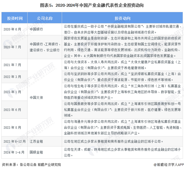 2020年以来,产业金融代表性企业的对外投资动向包括设立区域子公司、出资产业基金等。其中,银行和保险主体的对外投资多为出资成立基金,基金的投资动向包括能源、环保、半导体、医疗等多领域;租赁公司的对外投资多为成立区域子公司,主要设立在天津等地区。