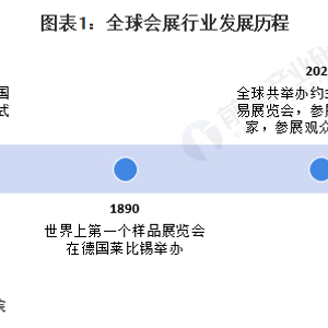 国际上会展行业的发展远早于中国,最早起源于欧洲。1851年5月,第一届世界博览会在英国伦敦开幕,共展出161天,吸引了630万人次的观众,这是会展活动正式形成的标志。1890年,世界上第一个样品展览会在德国莱比锡举办。此后,会展行业随着经济社会的进步也在不断发展,欧洲地区已成为全球会展业最发达的地区,其中德国被称为是“世界第一会展强国”。发展至2023年,当年全球共举办约3万场专业贸易展览会,参展商约440万家,参展观众约2.8亿人。