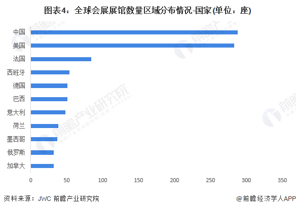 从会展展馆数量来看,目前中国和美国是会展展馆数量最多的2个国家,分别拥有288座和283座场馆。其次,法国、西班牙、德国、巴西(与德国并列)分别位居全球第3-6名,会展展馆数量均在50座以上。