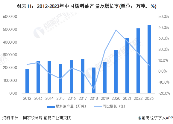 2010-2019年,我国燃料油产量波动范围较大。2019年我国燃料油产量为2469.7万吨,同比增长19%。2020年开始,中国燃料油产量逐年增长,2023年达到5364.70万吨,同比增长5.8%。