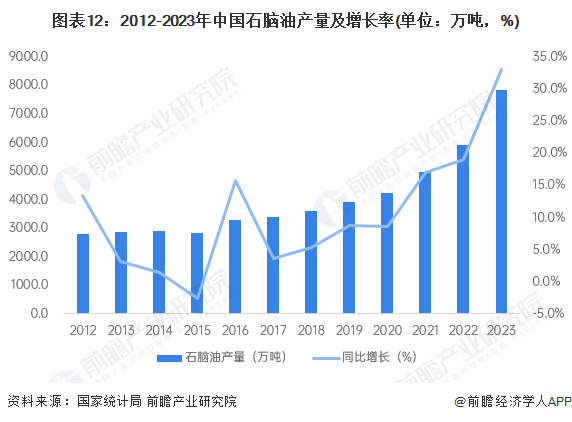 2015-2023年,我国柴油产量总体上呈现波动上升的态势,受炼厂产能利用率的提升影响,2023年我国柴油产量达到21729.00万吨,同比增长12.6%。