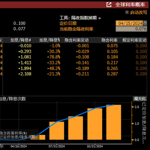 随着日本央行宣布政策调整,决定结束负利率和对收益率曲线的控制,市场对隔夜利率上调的预测也逐渐体现。根据OIS模型得到的隐含隔夜利率,截至4月15日,日本央行在七月加息0.1%的可能性为78.8%。在年底央行会议后,预计累计加息超过2次。