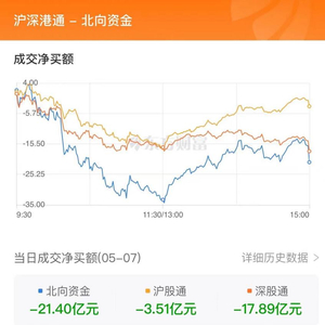 5月7日,两市震荡分化,三大指数涨跌不一。北向资金今日净卖出21.40亿元,其中,沪股通净卖出3.51亿元,深股通净卖出17.89亿元。北向资金今日成交金额1361.66亿元,占A股总成交额的14.06%。