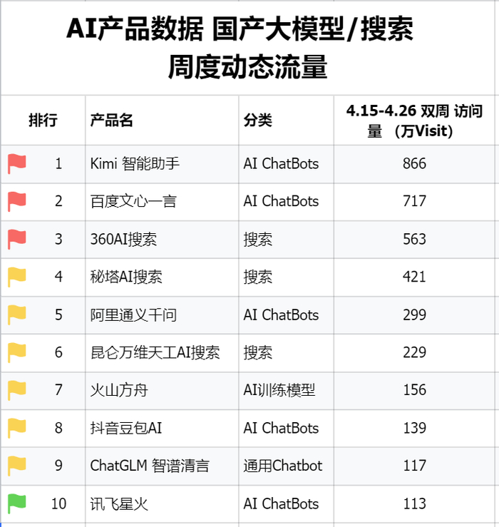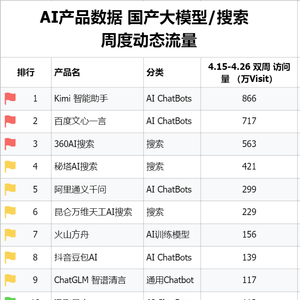 该网站近期数据显示,五一假期前后,360AI搜索用户访问量快速增长,国产AI应用访问量已位列第一。综合近期多个AI应用榜单数据,Kimi智能助手、文心一言以及360AI搜索已稳居前三,国产AI应用形成三巨头格局。