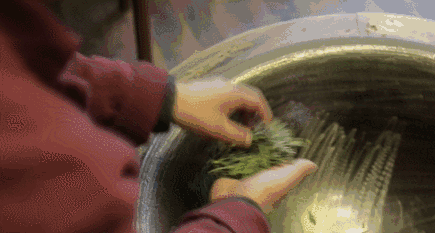 茶叶在热水的冲刷下翻腾旋转,芽叶舒展