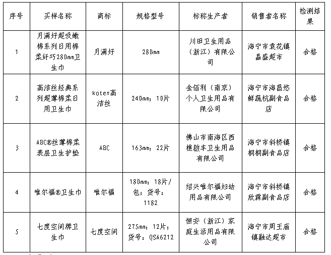 依据《2024年海宁市卫生巾(护垫)产品质量监督抽查实施细则》要求,本次监督抽查检测项目及判定依据。详见下表