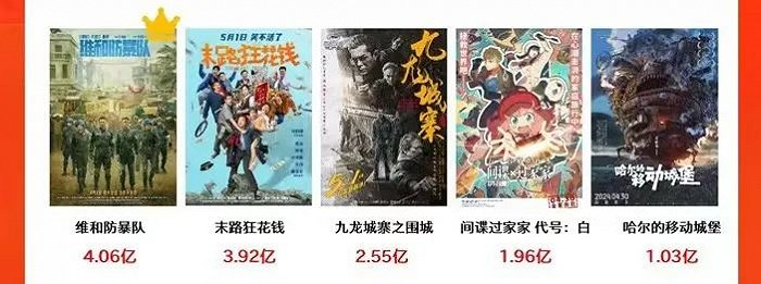 比起票房,影片在口碑上的两极分化要更加严重。《九龙城寨》《间谍过家家》豆瓣评分7.5,重映片《哈尔的移动城堡》更是有9.1分;而位于头部梯队的《维和防暴队》《末路狂花钱》则分别仅有5.5分和6.1分,档期内垫底。和去年五一的情况相比,头部梯队同样是主旋律+喜剧的组合,《长空之王》《人生路不熟》在档期刚结束时豆瓣评分还有6.8分和6.6分,不过,去年五一档也没有超过7.1分的影片(点此阅读:五一档没一个能打的)。
