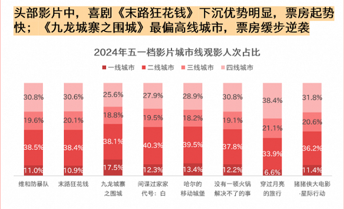 另一重原因是,如今电影市场的档期观影越来越依赖下沉市场的消费能力,而对下沉市场观众来说,口碑的不可见度更高。据猫眼《2024五一档数据洞察》,《维和防暴队》和《末路狂花钱》的下沉市场观影人次占比显著高于同档期大部分影片,而《九龙城寨》则明显更受一线城市观众欢迎。