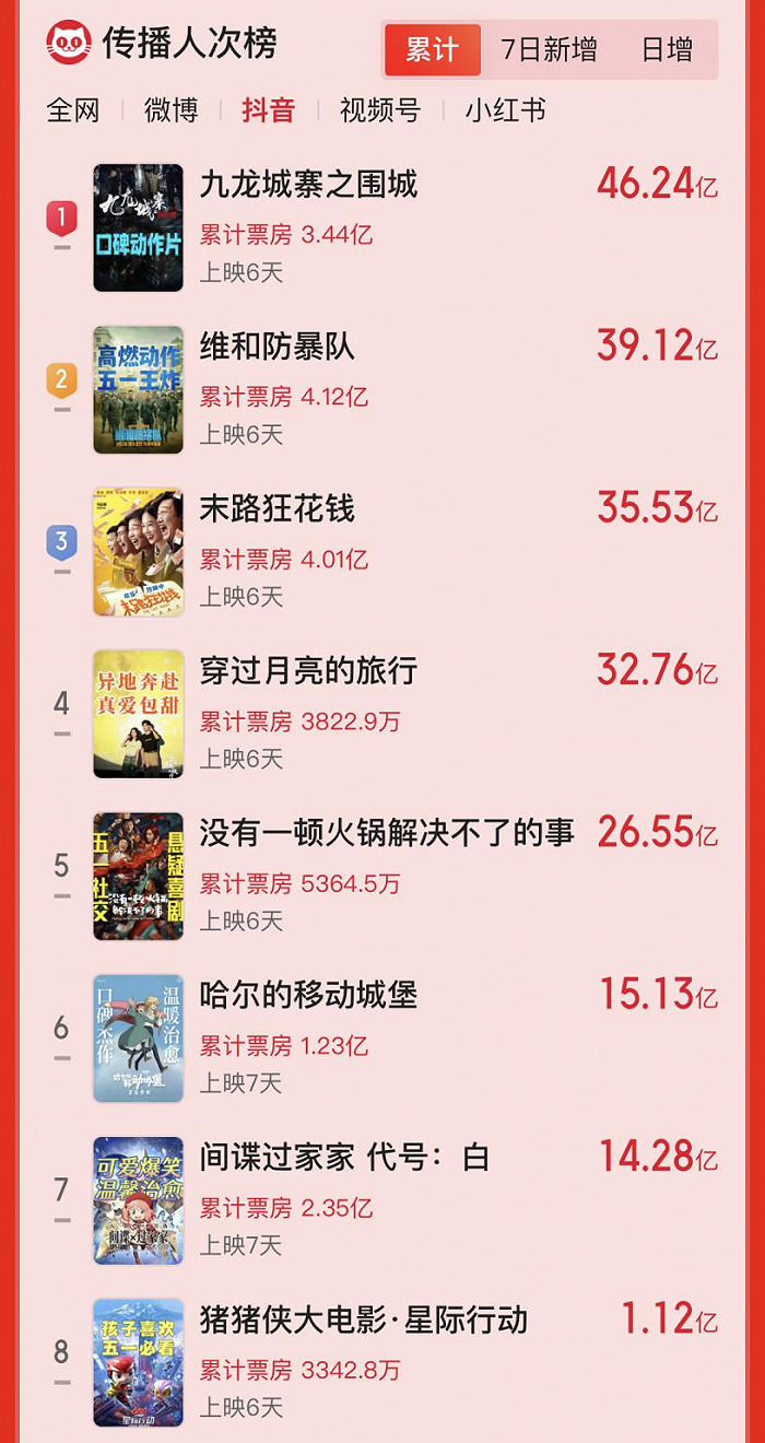 片方所迷信的短视频营销也并非万能。据猫眼主流平台传播战报,在抖音的累计传播人次中,最多的是《九龙城寨》,而《月亮》和《火锅》也并没有被拉开差距,反而是一直在短视频平台表现不佳的进口片,取得了中等成绩。