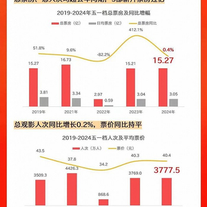 据猫眼专业版,五一档的总票房15.27亿,总人次3769.2万,平均票价40.4元,基本与2023年持平,低于2021年。只有总场次数据达到了240.4万,创历史新高,比去年多开了近10万场。对院线端来说,开的场次多了,人次却不见长,并不算一个太好的消息。