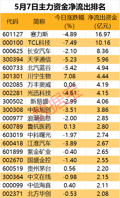 据数据宝统计,23股主力资金净流出超2亿元。其中赛力斯、TCL科技遭主力资金大幅砸盘,分别净流出16.97亿元、10.16亿元;长安汽车、天孚通信、北汽蓝谷、川宁生物等均遭主力资金大幅净流出超4亿元。