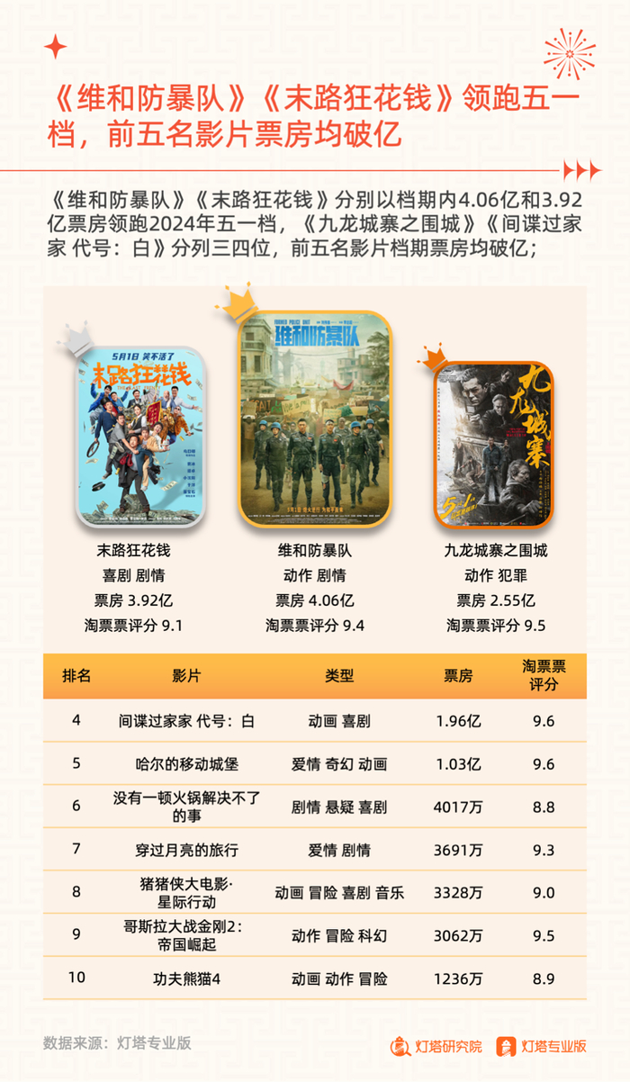 来自灯塔研究院的数据显示,前五名影片票房均破亿,其中《维和防暴队》《末路狂花钱》领跑,合计贡献一半以上票房,《九龙城寨之围城》《间谍过家家代号:白》票房贡献均超10%。