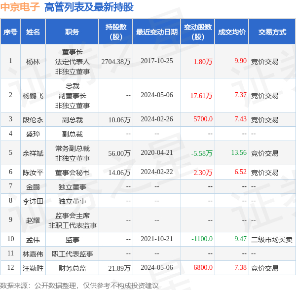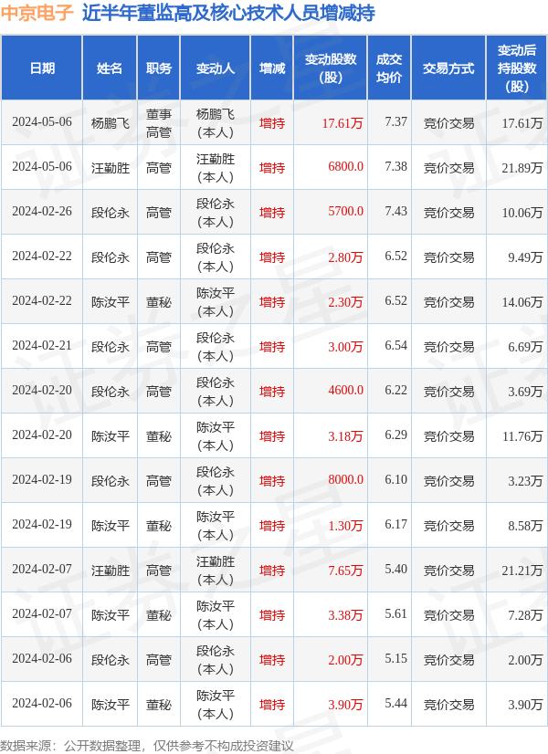 中京电子近半年内的董监高及核心技术人员增减持详情如下: