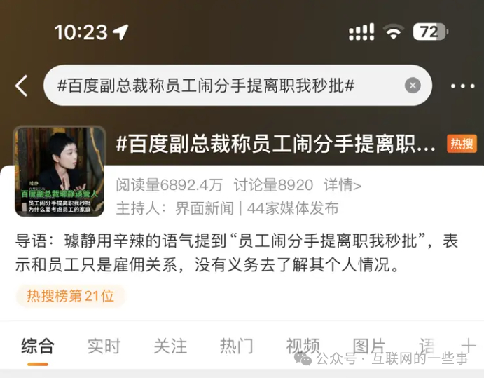 该事件引发了广泛的社会反响,微博上的话题“百度副总裁称员工闹分手提离职我秒批”、“百度副总裁5天涨粉(近)百万账号系购买”等也上了热搜。