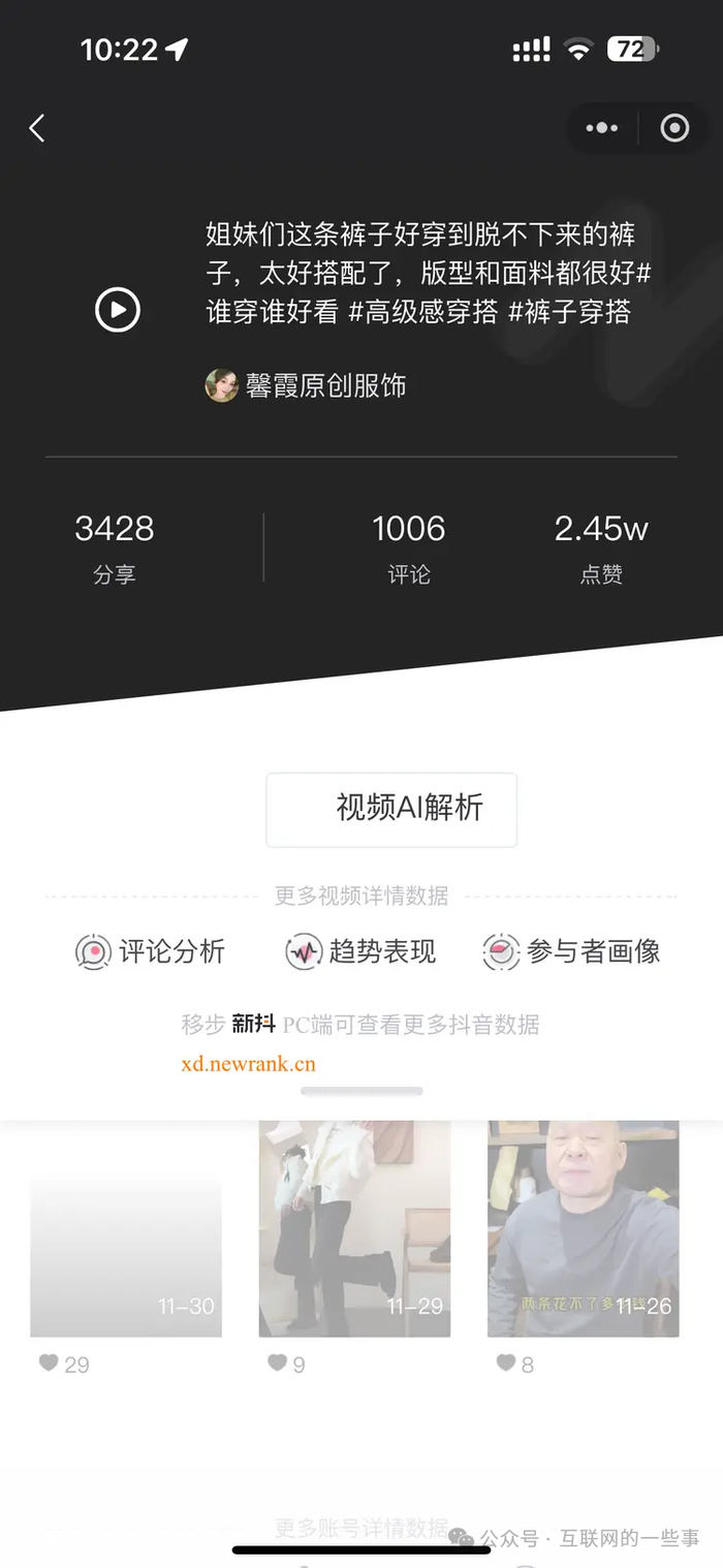 最奇怪的是,抖音平台上有一个关于这款账号的快照,显示的视频都是老账号的,原账号名字叫馨霞原创服饰,这就使得不少人质疑账号是不是买来的。