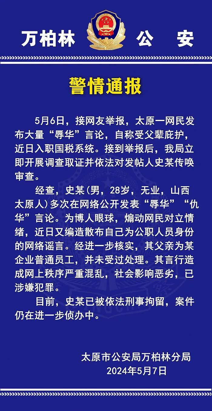 太原市公安局万柏林分局5月7日发布警情通报,5月6日,接网友举报,太原一网民发布大量“辱华”言论,自称受父辈庇护,近日入职国税系统。接到举报后,我局立即开展调查取证并依法对发帖人史某传唤审查。