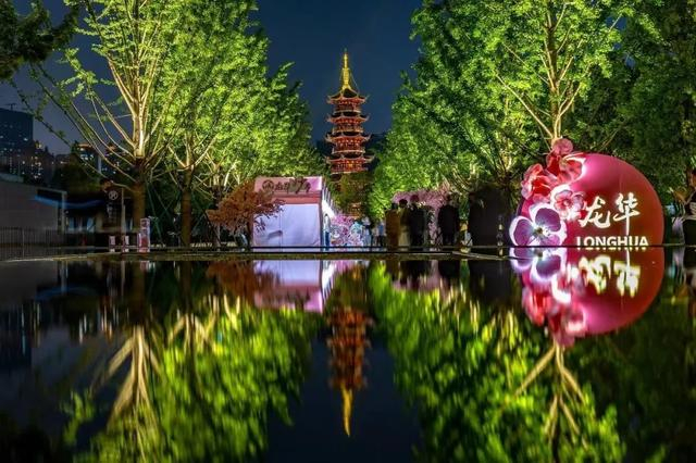 本届龙华庙会首次开启夜间“新玩法”,市集持续至晚上19:30结束,将白天的火热延续至黑夜。夜幕降临,柔美的灯光悄然照亮龙华塔尖,为塔尖披上一层宁静温和的光晕,历史人文建筑与现代光影艺术便完成了跨越千年的奇妙相遇。